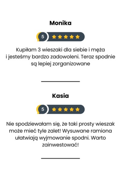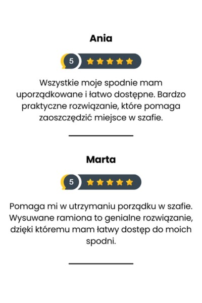 Nasz wieszak na 5 par spodni to idealny dodatek do Twojej garderoby. Zapewni Ci optymalne wykorzystanie przestrzeni w szafie, dzięki czemu Twoje ubrania pozostaną w idealnym porządku.